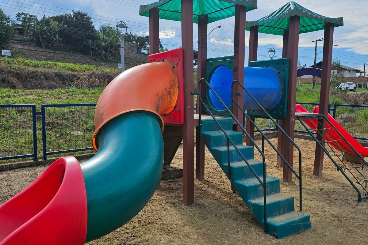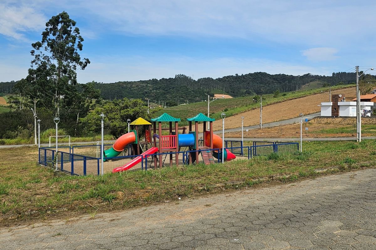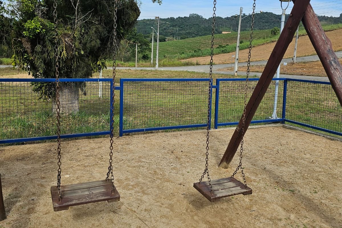 Ruas pavimentadas, rede de energia, drenagem pluvial, rede de água, área verde, e praça com playground e campo de futebol.